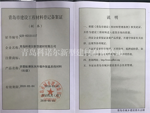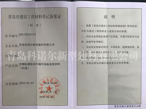 青島科諾爾新型建材有限公司主要產品:擠塑板( 阻燃B1級.B2級),泡沫板( 阻燃B1級.B2級)及各種造型,聚合物砂漿系列(粘結砂漿.罩面砂漿.膠粉.瓷磚粘接劑.填縫劑.界面劑),各種新型建材、保溫材料等等,公司產品遍銷全國各地,受到廣大用戶的一致好評。